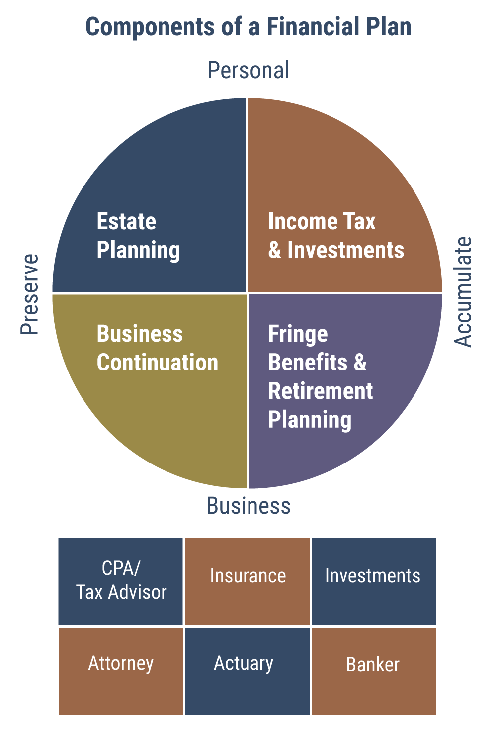 The estate portion deals with the preservation of one’s family assets, whereby fringe benefits tends to focus on maximizing business assets. Advisors from the various disciplines working as a team will seek to provide the client with the a disciplined and comprehensive financial plan.